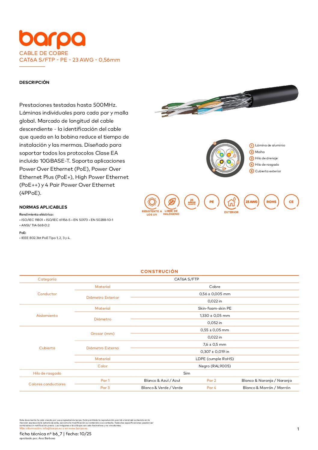 Jun 26, 2024 0 mins leitura Cable Cat.6A U/FTP LSZH Doble Cubierta – 23AWG – 700 MHz – Ficha Técnica barpaadminuser