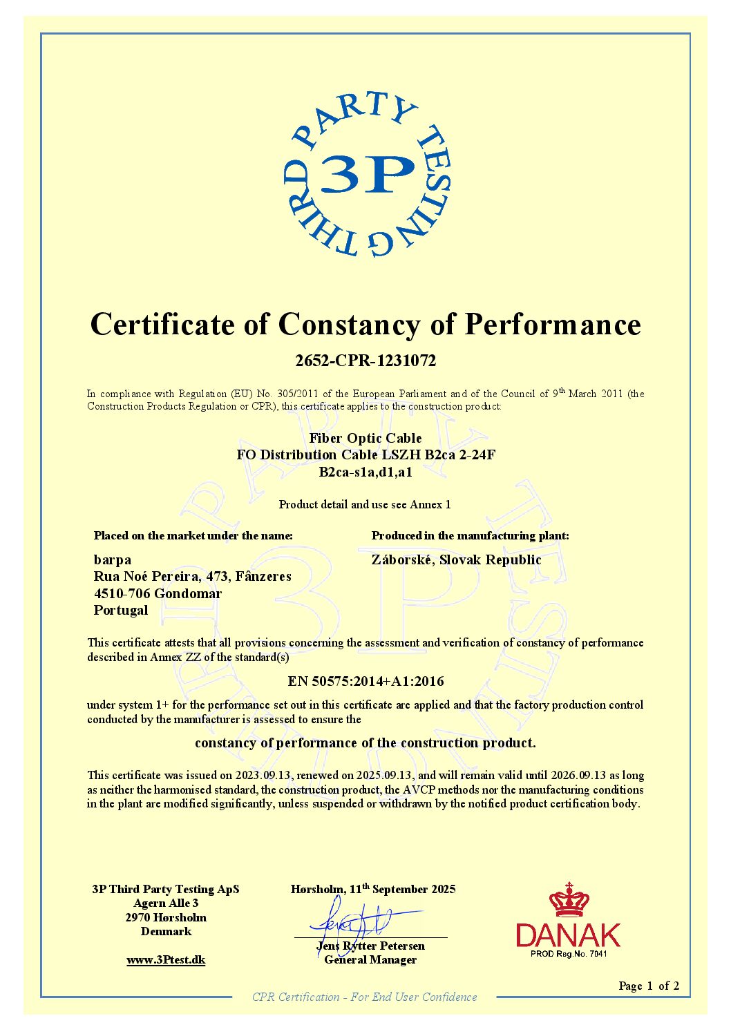 Cable de Distribución B2ca – LSZH – Certificado de Consistencia de Prestaciones